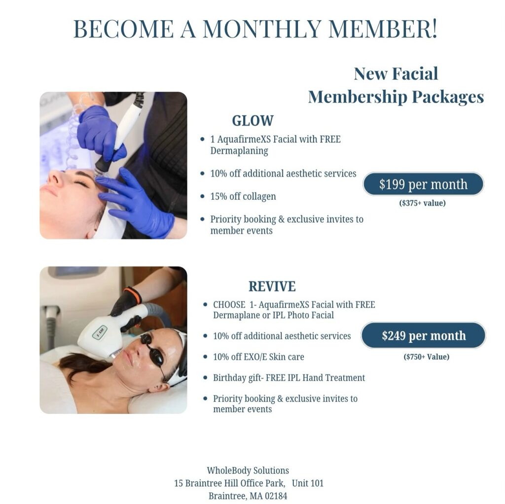 Introducing Our New Facial Memberships! Glowing skin just got easier! We’re thrilled to launch our exclusive facial membership program at WholeBody Solutions. Choose from two incredible options-GLOW or REVIVE-and enjoy premium skincare treatments, discounts, and VIP perks every month! 🏽♀️GLOW: AquafirmeXS Facial + FREE Dermaplaning + discounts & priority booking – $199/month ($375+ value!) REVIVE: Choice of AquafirmeXS Facial w/ Dermaplaning or IPL Photo Facial + VIP perks – $249/ month ($750+ value!) Members enjoy: ️Monthly facials for radiant skin ️Discounts on additional aesthetic treatments ️VIP priority booking & exclusive member events ️Special skincare savings & birthday treats! Join today and elevate your skincare routine! Call us or visit to sign up 617-328-6300 WholeBody Solutions | Braintree, MA