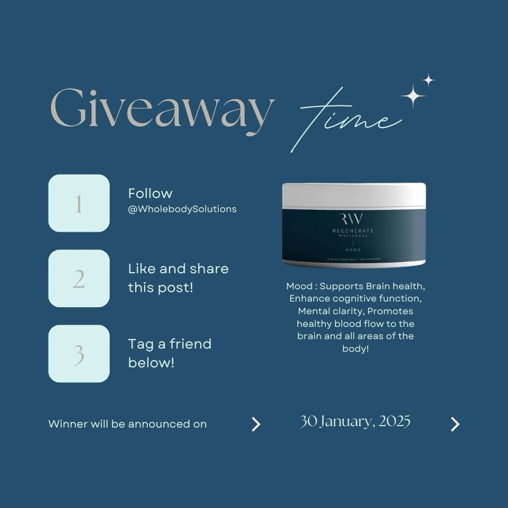 GIVEAWAY ALERT Boost your mood naturally with Mood! We’re giving one lucky winner the chance to try this incredible supplement for FREE! Here’s how to enter: 1️⃣ Follow @wholebodysolutions 2️⃣ Like and share this post 3️⃣ Tag a friend below who would LOVE to try Mood! Hurry, the giveaway ends January 24th! Winner will be announced in our stories on January 30th! Don’t miss out—your best mood ever is just one entry away! #Giveaway #BoostYourMood #NaturalWellness #MoodSupport #HolisticHealth #FamilyFirst #HealthyLiving #CommunityWellness