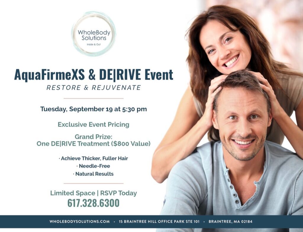 Join us for an amazing event Tuesday, September 19th at 5:30 PM. We will be discussing our AQUAFIRMEXS machine which has two amazing uses. One is needle free hair restoration and the other is a medical grade facial. Do either of these treatments interest you? If yes, you won’t want to miss this event where special pricing will be offered to all attendees. Please RSVP space is limited!! 🧖🏻♀️🩵 • • • #NeedleFreeHairRestoration #MedicalGradeFacial #AquaFirmeXS #WholebodySolutions #Braintree #Boston #InsideAndOut #Aesthetics #HolisticHealth #Healing #Acupuncture #BrainIntegration #Chiropractor #MedSpa #EmSculptNEO #Beauty #Confidence #AMP #Skin #Exfoliate #Moisturize #Hydrate #AntiAging #SkinTone • • Wholebody Solutions 15 Braintree Hill Office Park, Suite 101 Braintree, MA, 02184 617-328-6300