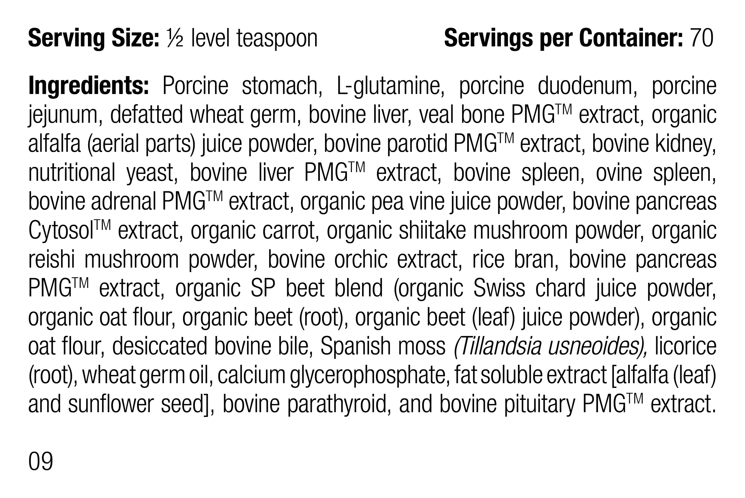 Each Serving Size ( 1/8 or 1/2 Level Teaspoon) contains: Ingredients: Porcine stomach, L-glutamine, porcine duodenum, porcine jejunum, defatted wheat germ, bovine liver, veal bone PMGTM extract, organic alfalfa (aerial parts) juice powder, bovine parotid PMGTM extract, bovine kidney, nutritional yeast, bovine liver PMGTM extract, bovine spleen, ovine spleen, bovine adrenal PMGTM extract, organic pea vine juice powder, bovine pancreas CytosolTM extract, organic carrot, organic shiitake mushroom powder, organic reishi mushroom powder, bovine orchic extract, rice bran, bovine pancreas PMGTM extract, organic SP beet blend (organic Swiss chard juice powder, organic oat flour, organic beet (root), organic beet (leaf) juice powder), organic oat flour, desiccated bovine bile, Spanish moss (Tillandsia usneoides), licorice (root), wheat germ oil, calcium glycerophosphate, fat soluble extract [alfalfa (leaf) and sunflower seed], bovine parathyroid, and bovine pituitary PMGTM extract.