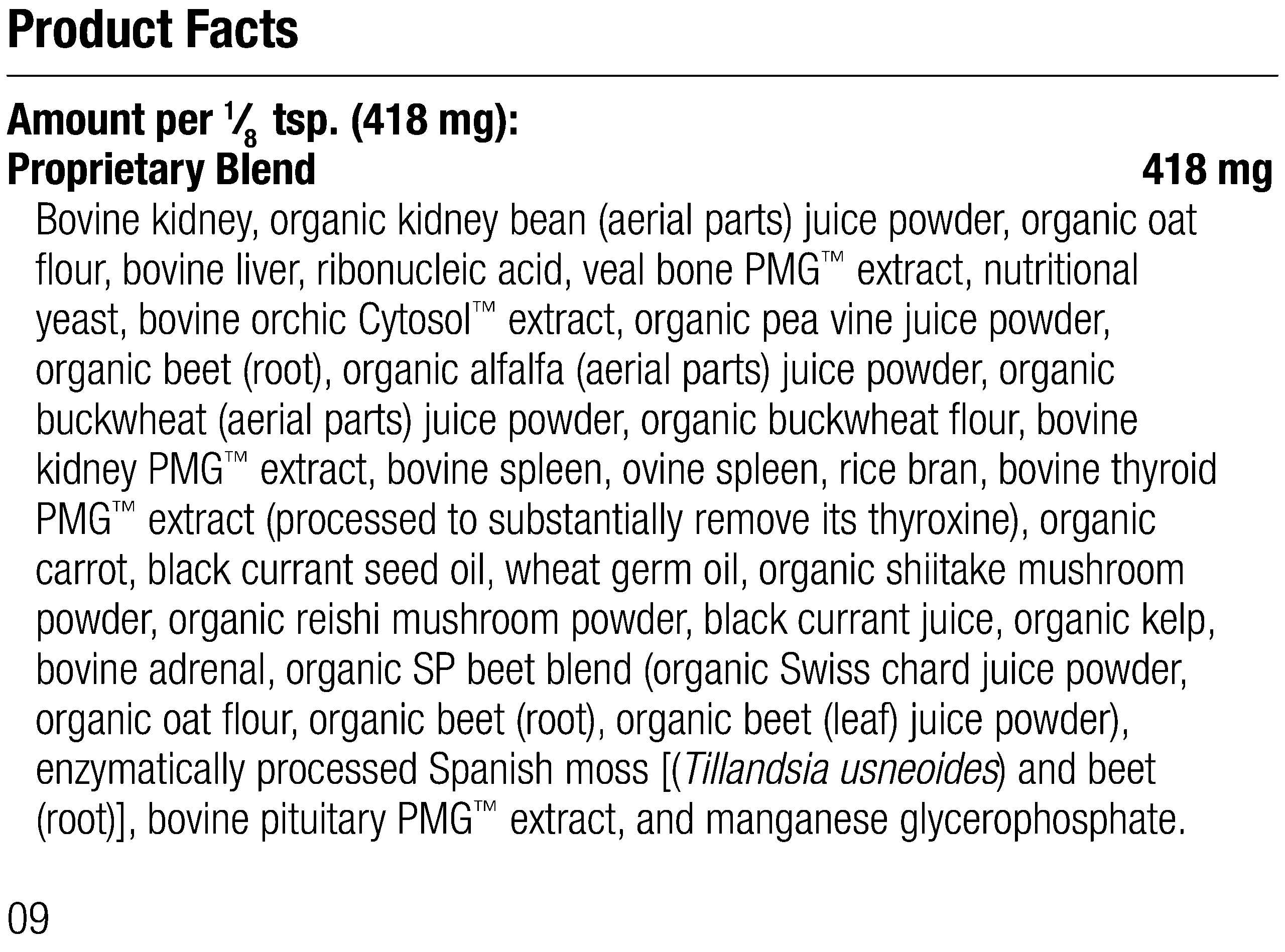 Bovine kidney, organic kidney bean (aerial parts) juice powder, oat flour, bovine liver, ribonucleic acid, veal bone, nutritional yeast, bovine orchic Cytosolâ„¢ extract, organic beet (root), organic pea vine juice powder, organic buckwheat (aerial parts) juice powder, organic buckwheat flour, organic alfalfa (aerial parts) juice powder, bovine kidney PMGâ„¢ extract, bovine spleen, ovine spleen, rice bran, bovine thyroid PMGâ„¢ extract (processed to substantially remove its thyroxine), organic carrot, black currant seed oil, wheat germ oil, organic shiitake mushroom powder, organic reishi mushroom powder, kelp, bovine adrenal, black currant juice, matlodextrin, enzymatically processed Spanish moss (Tillandsia usneoides) and beet (root), bovine pituitary PMGâ„¢ extract, fat soluble extract from alfalfa (leaf) and sunflower seed, manganese glycerophosphate, and organic beet (leaf) juice powder.