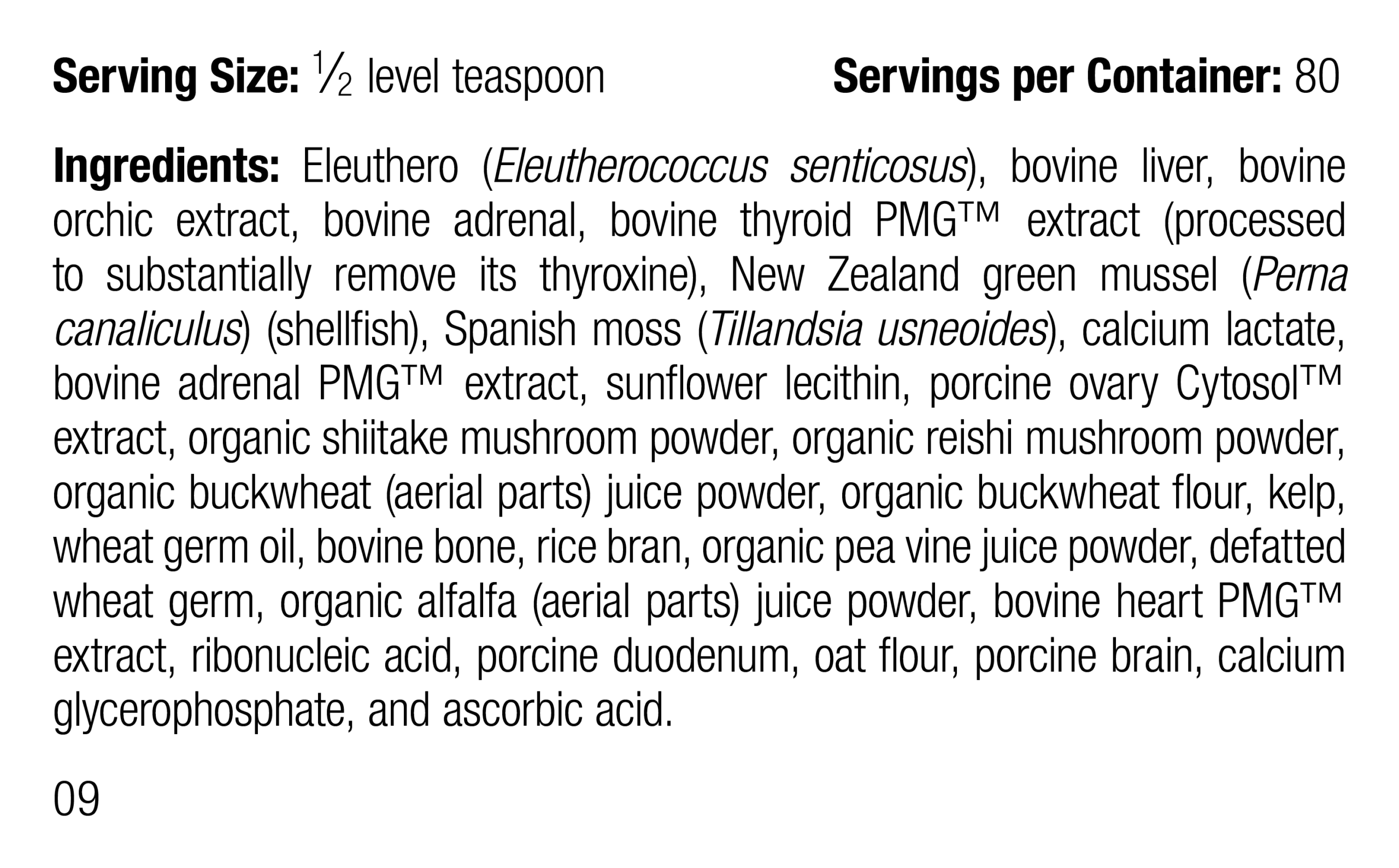 Each Serving Size (1/8 or 1/2 Level Teaspoon) contains: Ingredients: Eleuthero (Eleutherococcus senticosus), bovine liver, bovine orchic extract, bovine adrenal, bovine thyroid PMGâ„¢ extract (processed to substantially remove its thyroxine), New Zealand green mussel (Perna canaliculus) (shellfish), Spanish moss (Tillandsia usneoides), calcium lactate, bovine adrenal PMGâ„¢ extract, sunflower lecithin, porcine ovary Cytosolâ„¢ extract, organic shiitake mushroom powder, organic reishi mushroom powder, organic buckwheat (aerial parts) juice powder, organic buckwheat flour, kelp, wheat germ oil, bovine bone, rice bran, organic pea vine juice powder, defatted wheat germ, organic alfalfa (aerial parts) juice powder, bovine heart PMGâ„¢ extract, ribonucleic acid, porcine duodenum, oat flour, porcine brain, calcium glycerophosphate, and ascorbic acid.