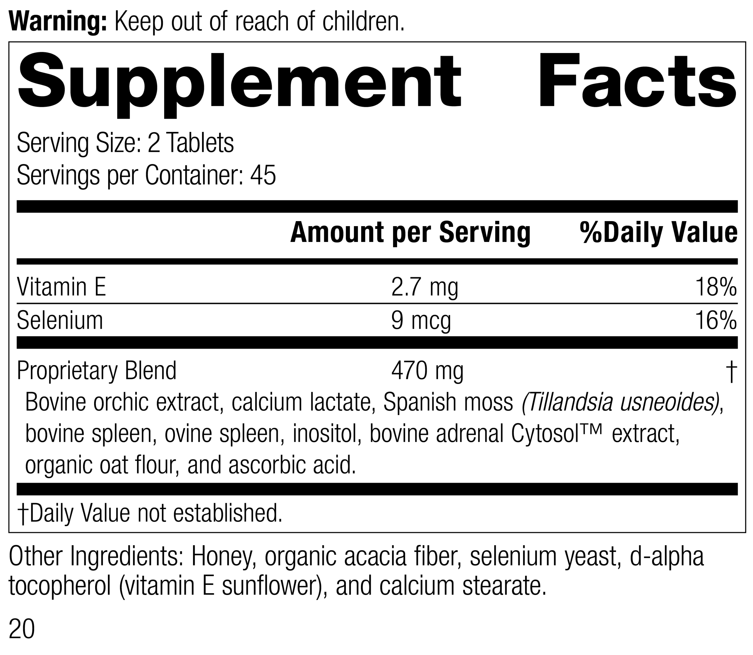 Each Serving Size (2 Tablets) contains: Vitamin E 2.7 mg, Selenium 9 mcg. Proprietary Blend 470 mg: Bovine orchic extract, calcium lactate, Spanish moss (Tillandsia usneoides), bovine spleen, ovine spleen, inositol, bovine adrenal Cytosol™ extract, organic oat flour, and ascorbic acid. Other Ingredients: Honey, organic acacia fiber, selenium yeast, d-alpha tocopherol (vitamin E sunflower), and calcium stearate.