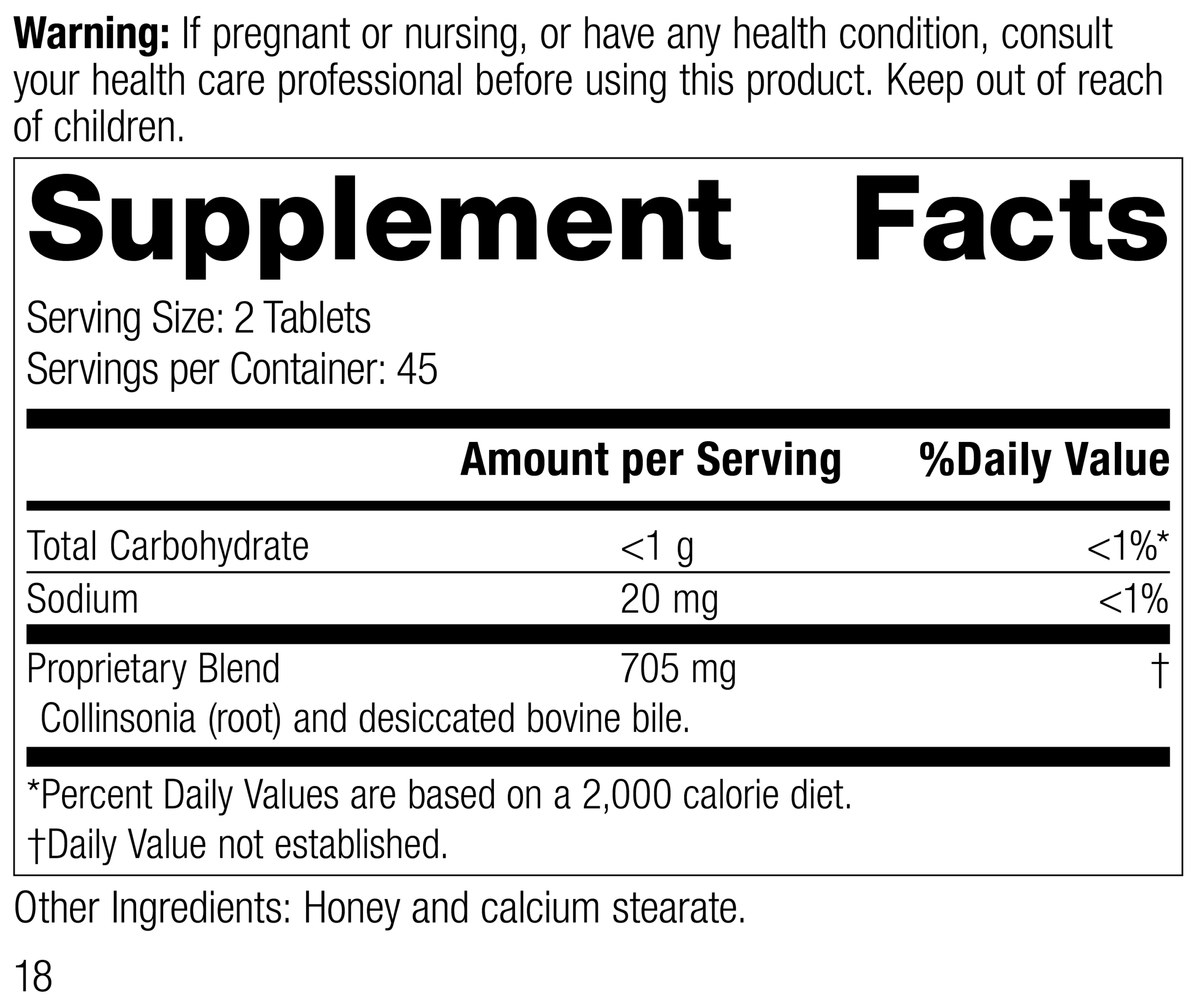 Each Serving Size (2 Tablets) contains: Total Carbohydrate <1 g, Sodium 20 mg. Proprietary Blend 705 mg: Collinsonia (root) and desiccated bovine bile. Other Ingredients: Honey and calcium stearate.
