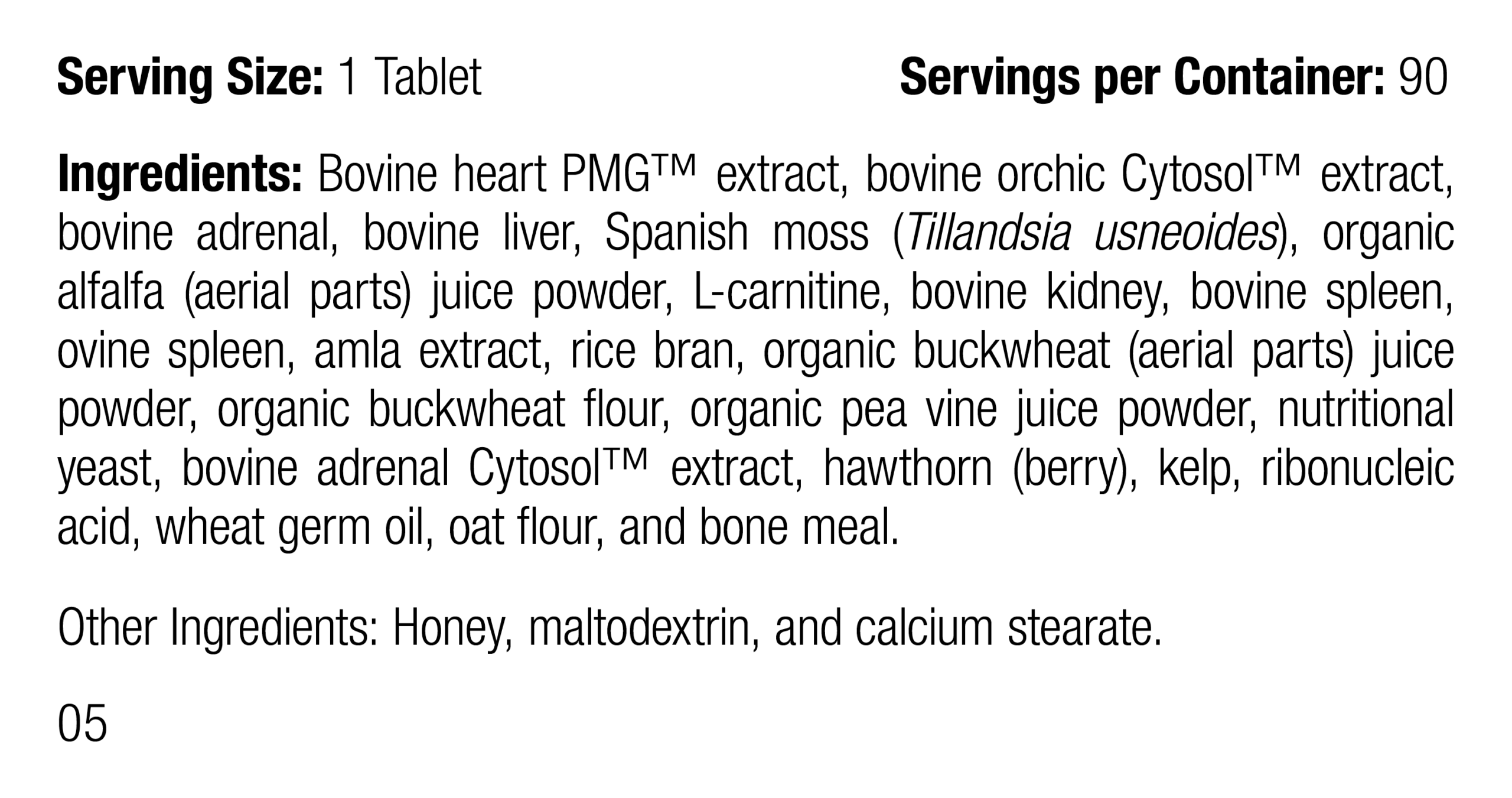 Each Serving Size (1 Tablet) contains: Ingredients: Bovine heart PMGTM extract, bovine orchic CytosolTM extract, bovine adrenal, bovine liver, Spanish moss (Tillandsia usneoides), organic alfalfa (aerial parts) juice powder, L-carnitine, bovine kidney, bovine spleen, ovine spleen, amla extract, rice bran, organic buckwheat (aerial parts) juice powder, organic buckwheat flour, organic pea vine juice powder, nutritional yeast, bovine adrenal CytosolTM extract, hawthorn (berry), kelp, ribonucleic acid, wheat germ oil, oat flour, and bone meal. Other Ingredients: Honey, maltodextrin, and calcium stearate.