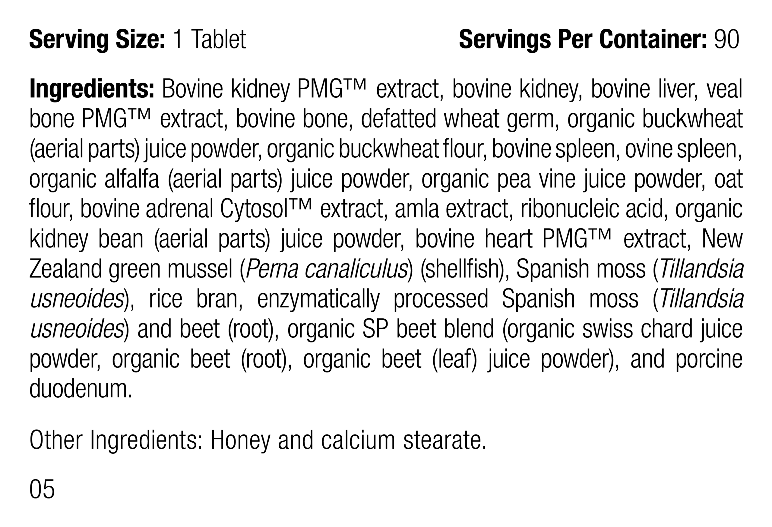 Each Serving Size (1 Tablet) contains: Ingredients: Bovine kidney PMGâ„¢ extract, bovine kidney, bovine liver, veal bone PMGâ„¢ extract, bovine bone, defatted wheat germ, organic buckwheat (aerial parts) juice powder, organic buckwheat flour, bovine spleen, ovine spleen, organic alfalfa (aerial parts) juice powder, organic pea vine juice powder, oat flour, bovine adrenal Cytosolâ„¢ extract, amla extract, ribonucleic acid, organic kidney bean (aerial parts) juice powder, bovine heart PMGâ„¢ extract, New Zealand green mussel (Perna canaliculus) (shellfish), Spanish moss (Tillandsia usneoides), rice bran, enzymatically processed Spanish moss (Tillandsia usneoides) and beet (root), organic SP beet blend (organic swiss chard juice powder, organic beet (root), organic beet (leaf) juice powder), and porcine duodenum. Other Ingredients: Honey and calcium stearate.