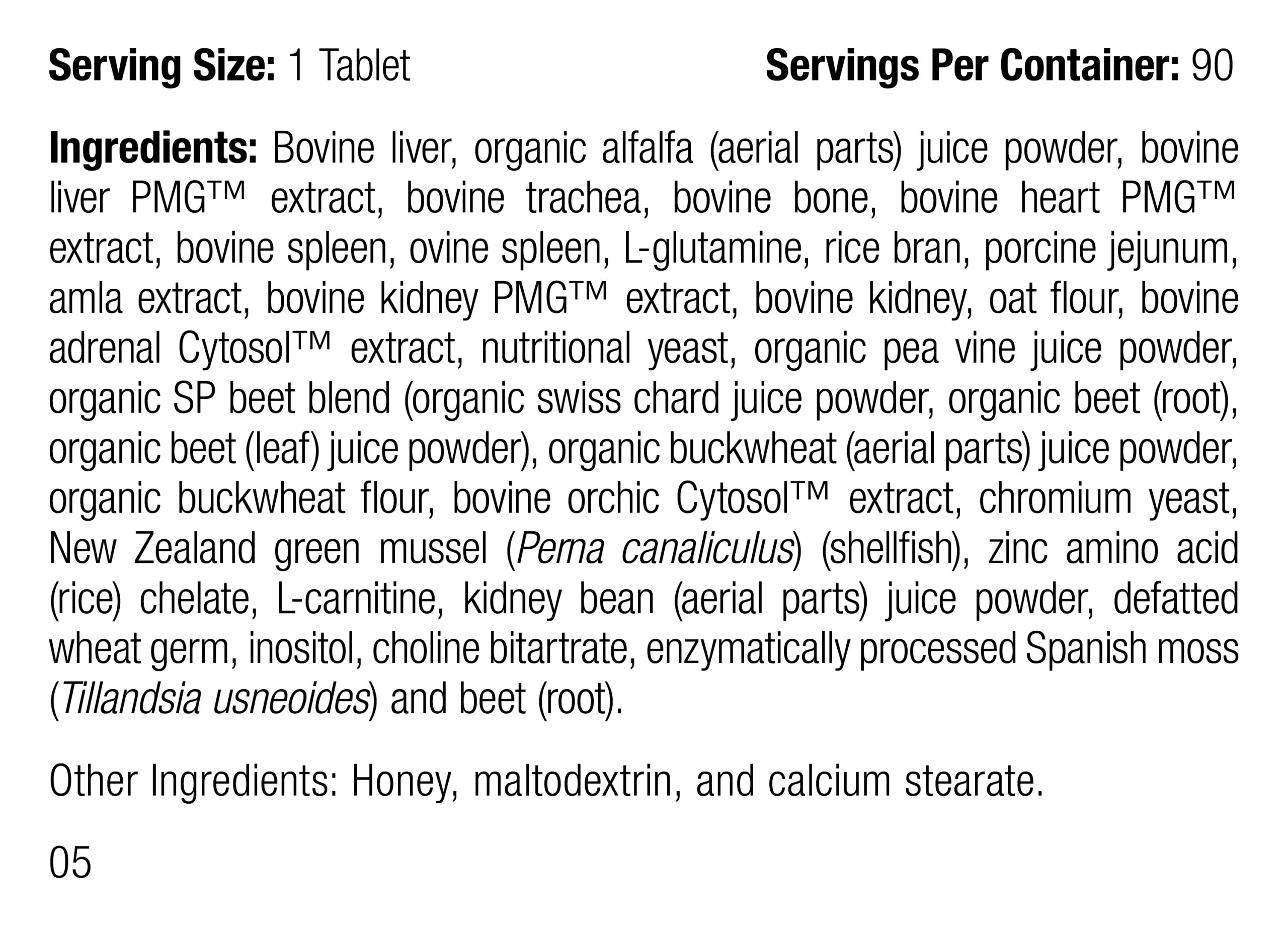 Each Serving Size (1 Tablet) contains: Ingredients: Bovine liver, organic alfalfa (aerial parts) juice powder, bovine liver PMGTM extract, bovine trachea, bovine bone, bovine heart PMGTM extract, bovine spleen, ovine spleen, L-glutamine, rice bran, porcine jejunum, amla extract, bovine kidney PMGTM extract, bovine kidney, oat flour, bovine adrenal CytosolTM extract, nutritional yeast, organic pea vine juice powder, organic SP beet blend (organic swiss chard juice powder, organic beet (root), organic beet (leaf) juice powder), organic buckwheat (aerial parts) juice powder, organic buckwheat flour, bovine orchic CytosolTM extract, chromium yeast, New Zealand green mussel (Perna canaliculus) (shellfish), zinc amino acid (rice) chelate, L-carnitine, kidney bean (aerial parts) juice powder, defatted wheat germ, inositol, choline bitartrate, enzymatically processed Spanish moss (Tillandsia usneoides) and beet (root). Other Ingredients: Honey, maltodextrin, and calcium stearate.