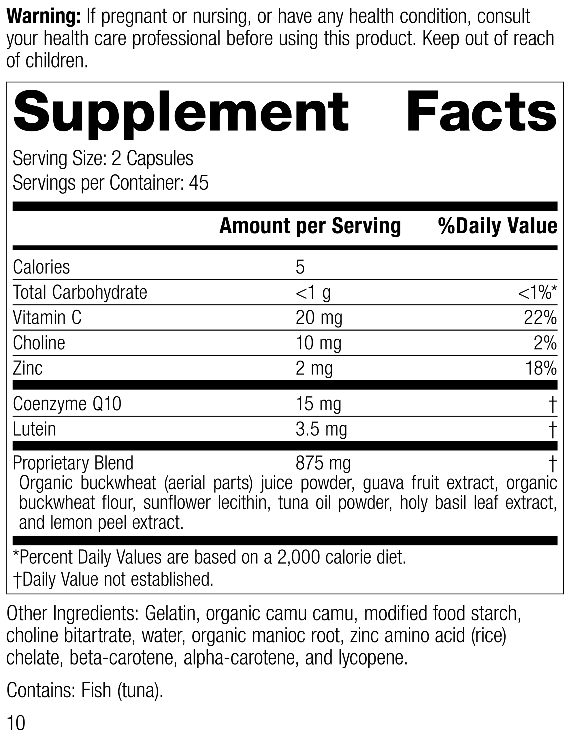 Each Serving Size (2 Capsules) contains: Calories 5, Total Carbohydrate <1 g, Vitamin C 20 mg, Choline 10 mg, Zinc 2 mg, Coenzyme Q10 15 mg, Lutein 3.5 mg. Proprietary Blend 875 mg: Organic buckwheat (aerial parts) juice powder, guava fruit extract, organic buckwheat flour, sunflower lecithin, tuna oil powder, holy basil leaf extract, and lemon peel extract. Other Ingredients: Gelatin, organic camu camu, modified food starch, choline bitartrate, water, organic manioc root, zinc amino acid (rice) chelate, beta-carotene, alpha-carotene, and lycopene. Contains: Fish (tuna).