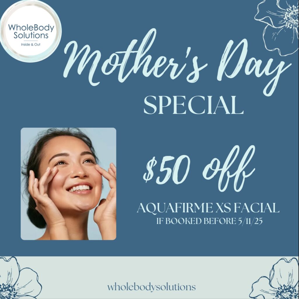 Give Mom the GLOW she deserves this Mother’s Day with our AquaFirme Facial Special — now $50 OFF! Treat her to radiant, refreshed skin — or grab one for yourself as the perfect gift idea! Purchase before Mother’s Day to lock in this exclusive deal! Limited time only – don’t miss out! $50 OFF AquaFirme Facial – the ultimate self-care gift! #MothersDayGlow #AquafirmeFacial #GlowingSkinForMom #WholebodySolutions #SelfCareGift #MomDeservesTheBest #SkincareSpecial #FacialDeal #MothersDayGiftIdeas
