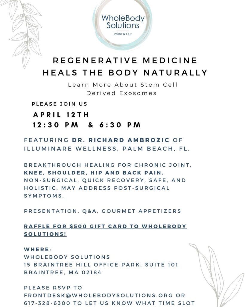 Come join us! Dr. Rick Ambrozic will be at Wholebody Solutions on Wednesday, April 12th. There will be presentations at 12:30 and 6:30 on safe and effective breakthrough healing for chronic joint and back pain. Reach out if you have any questions, we’d love to see you there! • • • #BreakthroughHealing #RegenerativeTherapy #SafeAndEffective #NoDrugs #NoDowntime #Exosomes #ChronicPain #JointPain #HolisticHealth #HolisticClinic #Healing #Chiropractor #InsideAndOut #WholebodySolutions • • Wholebody Solutions 15 Braintree Hill Office Park, Suite 101 Braintree, MA, 02184 617-328-6300