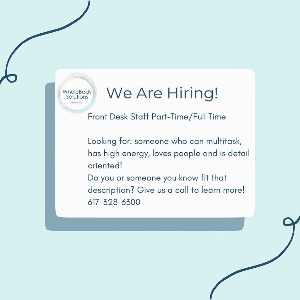 We’re hiring! Give us a call to learn more! 🤝🏼🩵 • • • #BostonJobs #BraintreeJobs #SouthShoreJobs #HolisticJobs #Nutrition #RegenerativeMedicine #ChronicPain #JointPain #HolisticHealth #HolisticClinic #Healing #Chiropractor #InsideAndOut #WholebodySolutions • • Wholebody Solutions 15 Braintree Hill Office Park, Suite 101 Braintree, MA, 02184 617-328-6300