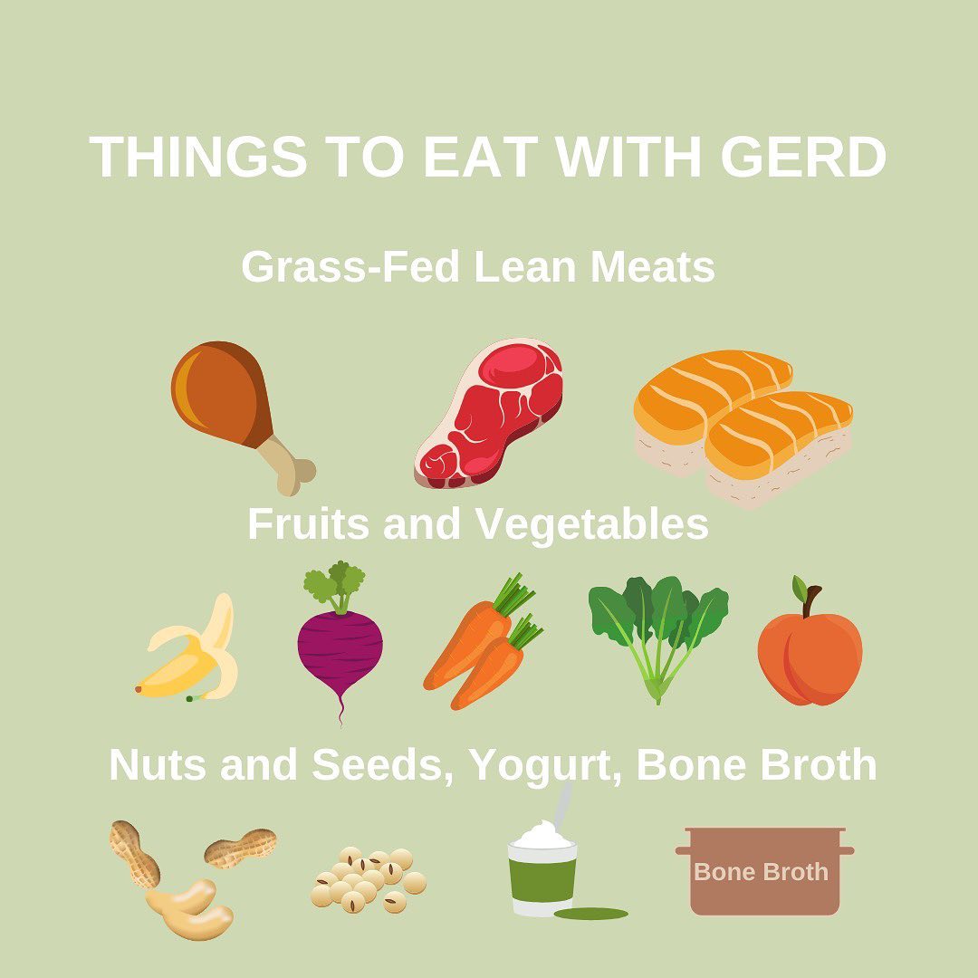 A GERD friendly diet consists of vegetables, fruits, grass fed lean meats, healthy fats, yogurts, nuts and seeds, bone broth.