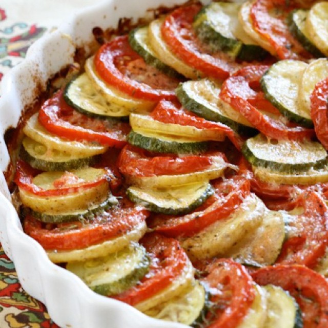 Layer tomatoes, potatoes and zucchini in alternating layers (as shown in photo above). Drizzle with olive oil and season with thyme, salt and pepper. Sprinkle with cheese. Place a piece of parchment paper over dish followed by a piece of foil (I do this because I prefer that the aluminum doesn’t touch the food). Wrap the foil tightly around the dish. Bake for 30 minutes, remove foil and parchment and bake for an additional 25 minutes, until golden brown and bubbly. Serve.